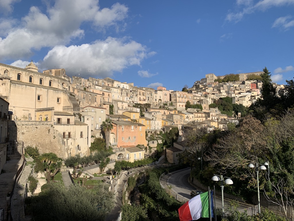 Ausser der Müllabfuhr, war die Altstadt noch fast menschenleer. Als ich wieder zurückkam, war Guy noch am Dösen. Er ist kein Morgenmensch und liebt es länger „unter der Decke“ zu verweilen. Nach dem leckeren Frühstück, spazierten wir zur Kirche Sant Lucia hoch, denn ich wollte Guy unbedingt diese tolle Aussicht auf Ragusa zeigen. Natürlich wollte ich auch ein Foto bei Tage schiessen von diesem spektakulären Ausblick.