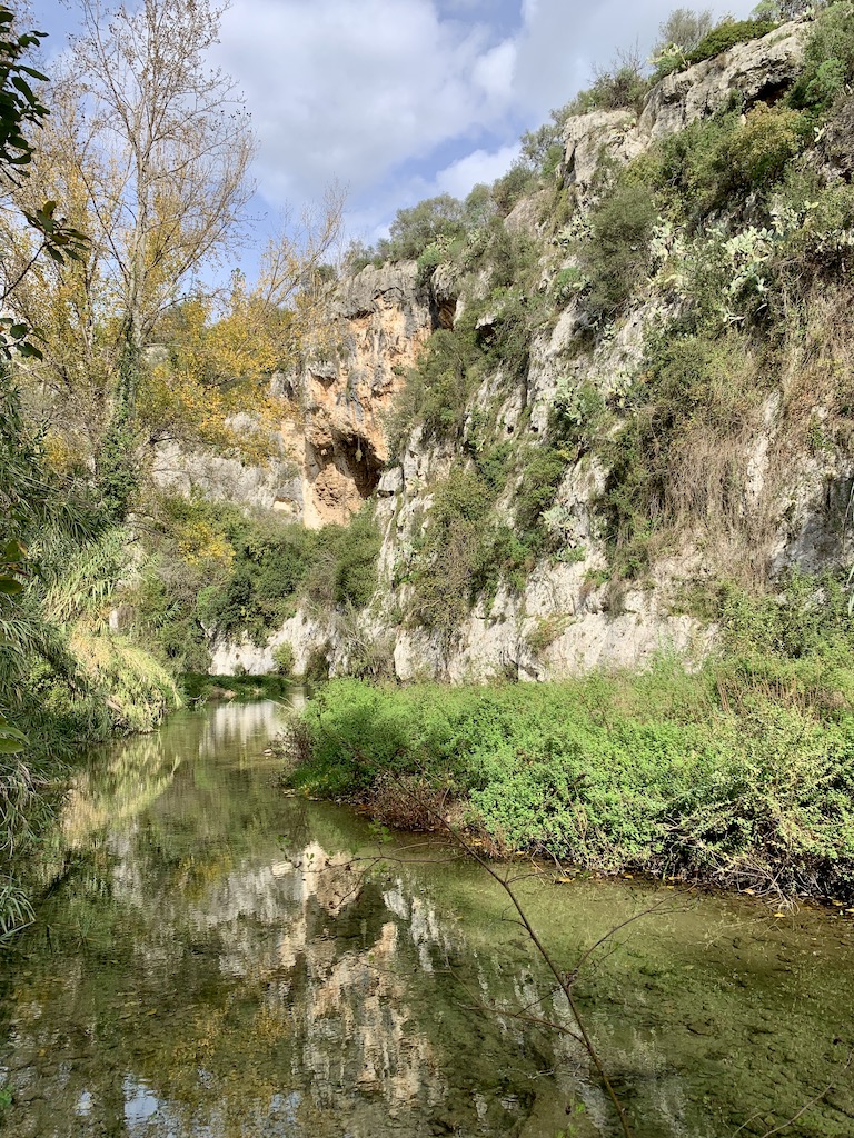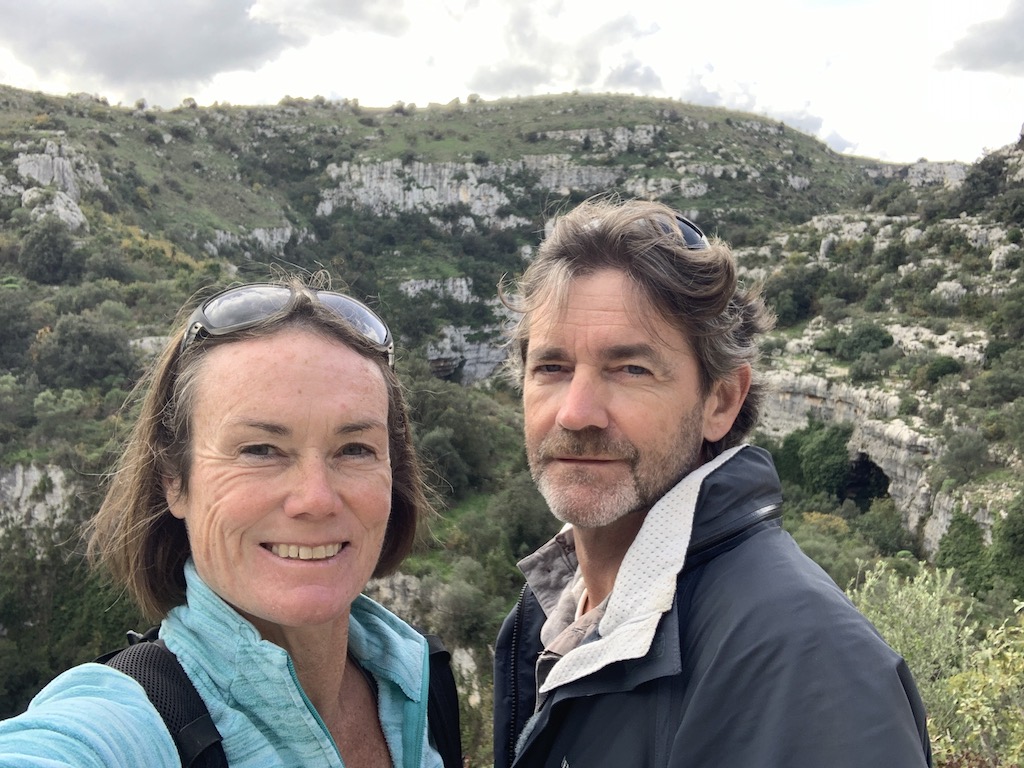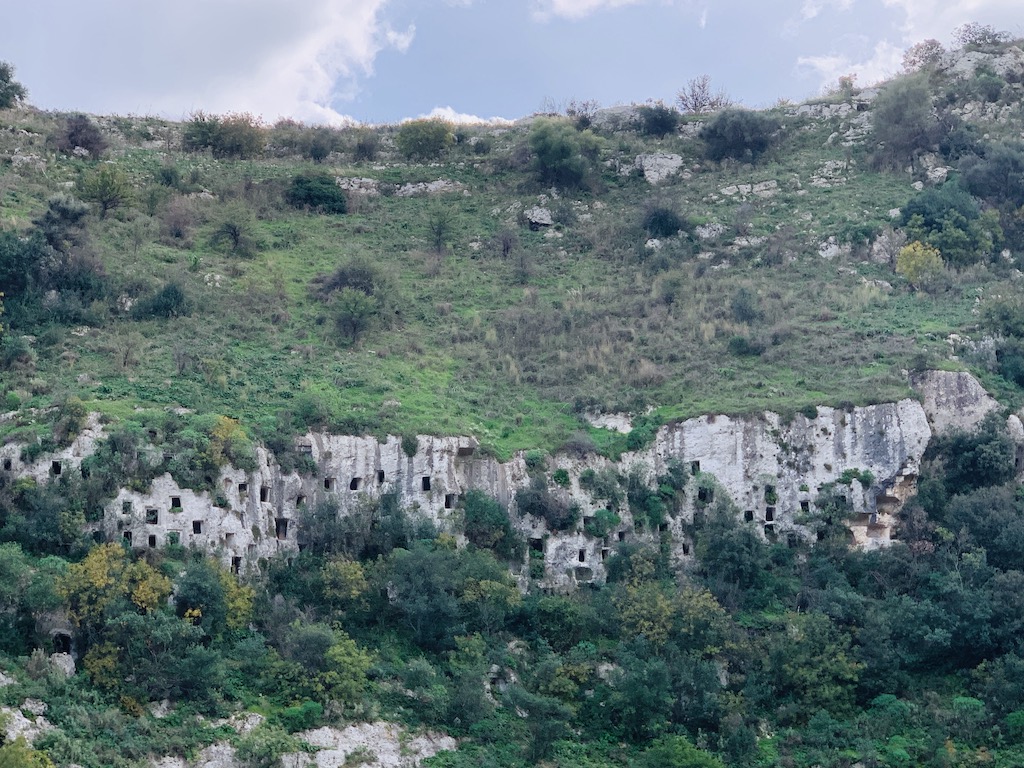 Am nächsten Morgen stand zuerst ein sehr ausgiebiges Frühstück auf dem Programm. Alles war mit viel Liebe und Sorgfalt präsentiert und es gab viele leckere Sachen zu probieren. Aber sündigen war erlaubt, denn wir hatten für heute eine längere Wanderung in der Anapo-Schlucht geplant. Das Valle dell’Anapo ist eine tiefe Schlucht im Naturschutzgebiet Pantalica, Valle dell’Anapo e Torrente Cava Grande. Sie ist bekannt für ihre üppige Natur, eine antike Nekropole, auch die „Totenstadt Pantalica“ genannt, die in die Felsen gegraben wurde, und einen alten, stillgelegten Eisenbahntunnel. Die Anfahrt war wieder echt anspruchsvoll. Immer wieder mussten wir wegen Strassensperrungen den direkten Weg verlassen und bis unser Navy eine neue Strecke errechnet hatte, dauerte es in dieser abgeschiedenen Gegend etwas länger. In Sortino angekommen, hatten wir unser Ziel schon fast erreicht. Nur noch 5 km zeigte uns das Navy an. Aber er lotste uns durch immer schmalere Gassen bis wir schlussendlich in einer Sackgasse angekommen waren, wo kein Platz mehr für eine Kehrtwende blieb. Hier stellte Guy dann wieder sein ganzes Fahrkönnen unter Beweis indem er ganz souverän den letzten Teil der Gasse rückwärts zurückfuhr, an parkenden Autos vorbei, bis er an der ersten Abzweigung genug Platz zum Wenden hatte. Riesen Respekt! Denn da hat definitiv nicht mehr als ein Finger dazwischen gepasst… wenn überhaupt. Auf jeden Fall hatten wir jetzt die Nase voll und folgten dem Navy nicht mehr blind, sondern entschieden uns für die breitere Umgehungstrasse. Nach 10 km waren wir dann endlich am Südosteingang von der Anapo-Schlucht angekommen. Hier befindet sich ein kleines Häuschen mit „Parkrangern“, wo man sich in ein Buch eintragen und danach wieder austragen muss, als Kontrolle ob sich niemand in der Schlucht und den vielen Wanderwegen in den Hängen verirrt und jeder die Schlucht wieder bei Dämmerung verlassen hat. Uns hat es sehr verwundert, dass hier kein Eintrittsgeld verlangt wird, denn bis jetzt haben wir hier in Italien die Erfahrung gemacht, dass man für gefühlt alles bezahlen muss. Aber hier ist das nicht der Fall und der Eintritt war gratis.