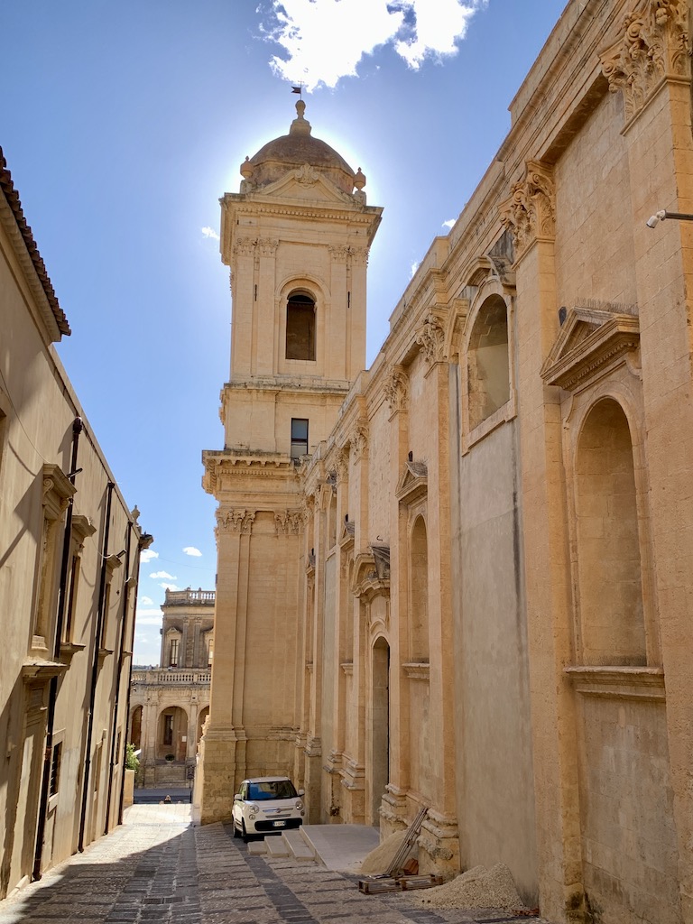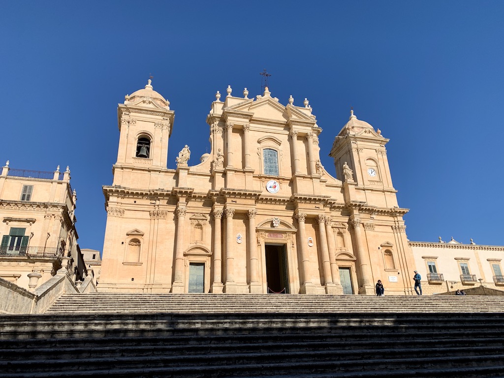 In Noto angekommen, steuerten wir einen Parkplatz an, den ich schon im Vorfeld ausfindig gemacht hatte, der gut erreichbar war und nur 10 Minuten entfernt von den Sehenswürdigkeiten der Altstadt lag. Noto ist die Hauptstadt des sizilianischen Barocks. Sie liegt 35 Kilometer südwestlich von Syrakus am Fusse der Monti Iblei. Noto wirkt wie eine sorgfältig komponierte Filmkulisse mit imposanten Kirchen, Klöstern und Palazzi. Dass Noto heute so bezaubernd daher kommt, hat seinen Ursprung in einer Katastrophe. Die Stadt wurde 1693 bei einem Erdbeben komplett zerstört und danach, acht Kilometer weiter unten im Tal, wieder aufgebaut. In den darauf folgenden Jahrzehnten wurden die besten Architekten der Zeit engagiert. Sie bauten Noto im Stile des sizilianischen Barocks innerhalb weniger Jahrzehnte wieder auf und folgten dabei einem strengen Rastersystem. Das unbestrittene Wahrzeichen von Noto ist die Kathedrale San Nicolò.