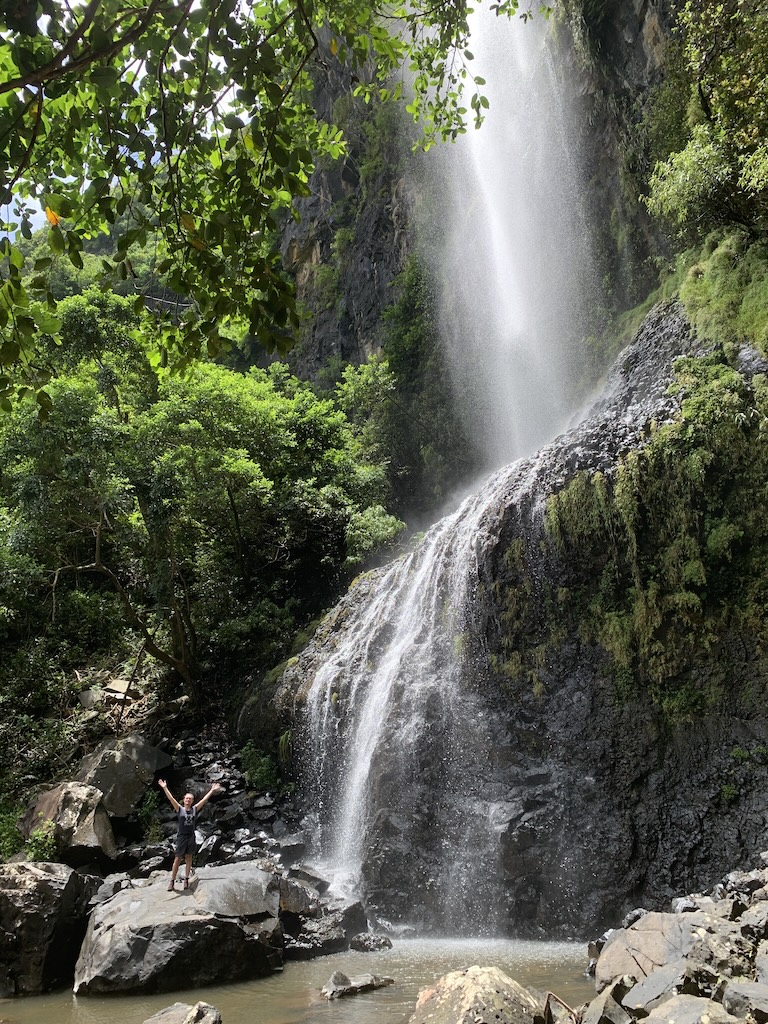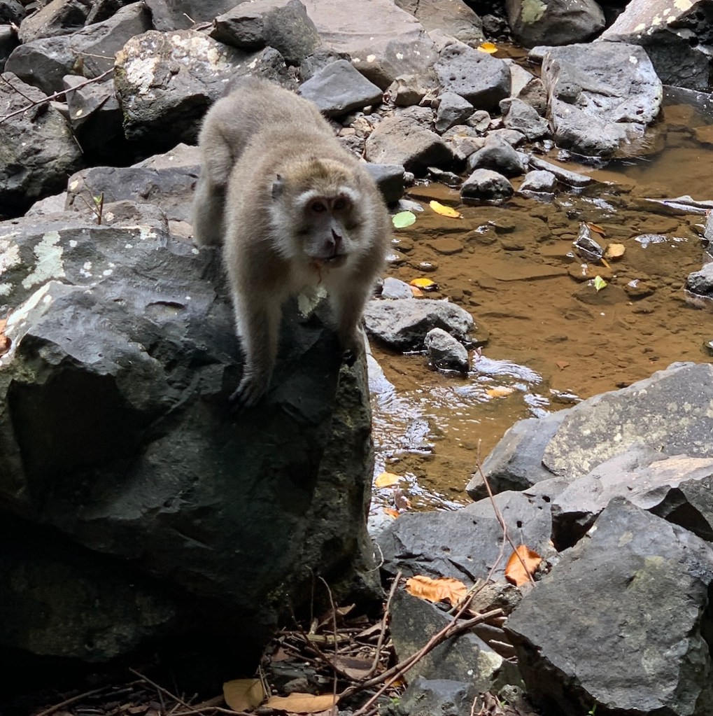 Der Weg durch den dichten Regenwald und gleichzeitig das Plätschern des Flusses, war echt ein tolles Erlebnis. Kurz bevor wir am Wasserfall ankamen, verstärkte sich das Rauschen des Wassers. Aber da war auch noch ein anderes Geräuch, Äste knaksten, komische Laute… und dann erblickte ich einen Affen, der uns aus sicherer Entfernung beobachtete.