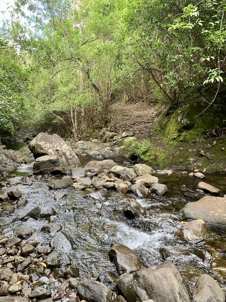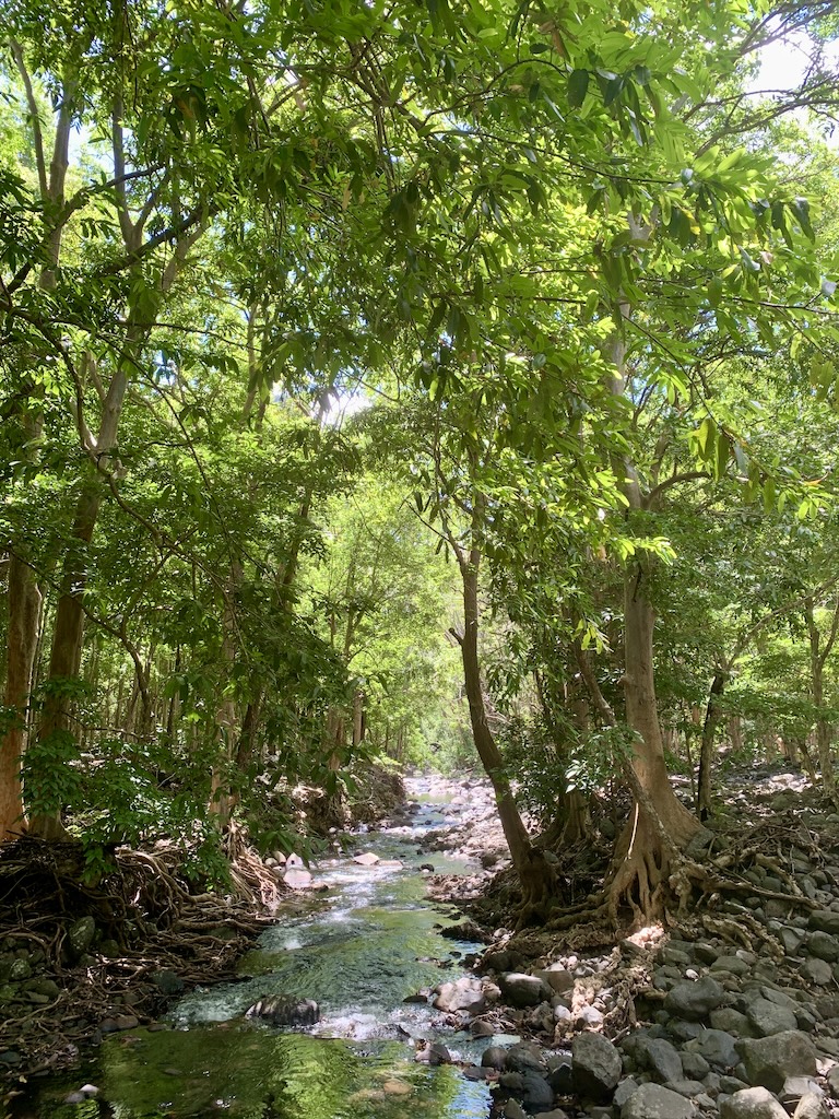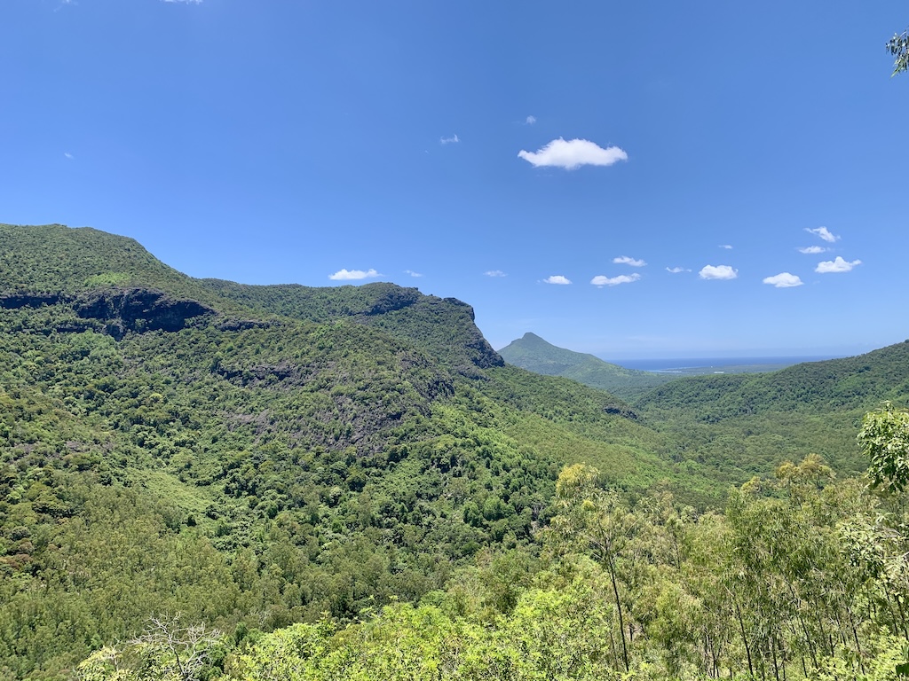 Bevor unser Termin am Sonntag im Hotel Paradise Cove anstand, schnürrten wir erneut die Wanderschuhe. Da mir unsere erste Wanderung zum Black River Peak durch den dichten Regenwald des Black River Nationalpark so gut gefallen hatte, überredete ich Guy zu einer weiteren Wanderung, diesmal zu einem Wasserfall. Bis zu unserem Startpunkt, dem Parking Hiking and Exploring Mauritius Meeting Point, brauchten wir eine gute halbe Stunde. Von hier aus kann man viele verschiedene Touren machen. Wir wollten zu dem „Mare aux Joncs“ Wasserfall. Ich hatte schon im Vorfel gelesen, dass der Weg grösstenteils dem Fluss folgt. Daher war ich der Meinung, dass wir diesmal mit weniger Steigung rechnen müssten. Das stimmte soweit auch, aber ich war mir nicht bewusst, dass wir den Fluss gefühlt 20x überqueren mussten… und dies nicht mittels Brücken. Wir mussten jedes Mal über wakelige lose und leider auch feuchte und somit rutschige Steine jonglieren, jedes Mal in der Hoffnung nicht abzurutschen und trocken auf der anderen Seite anzukommen.