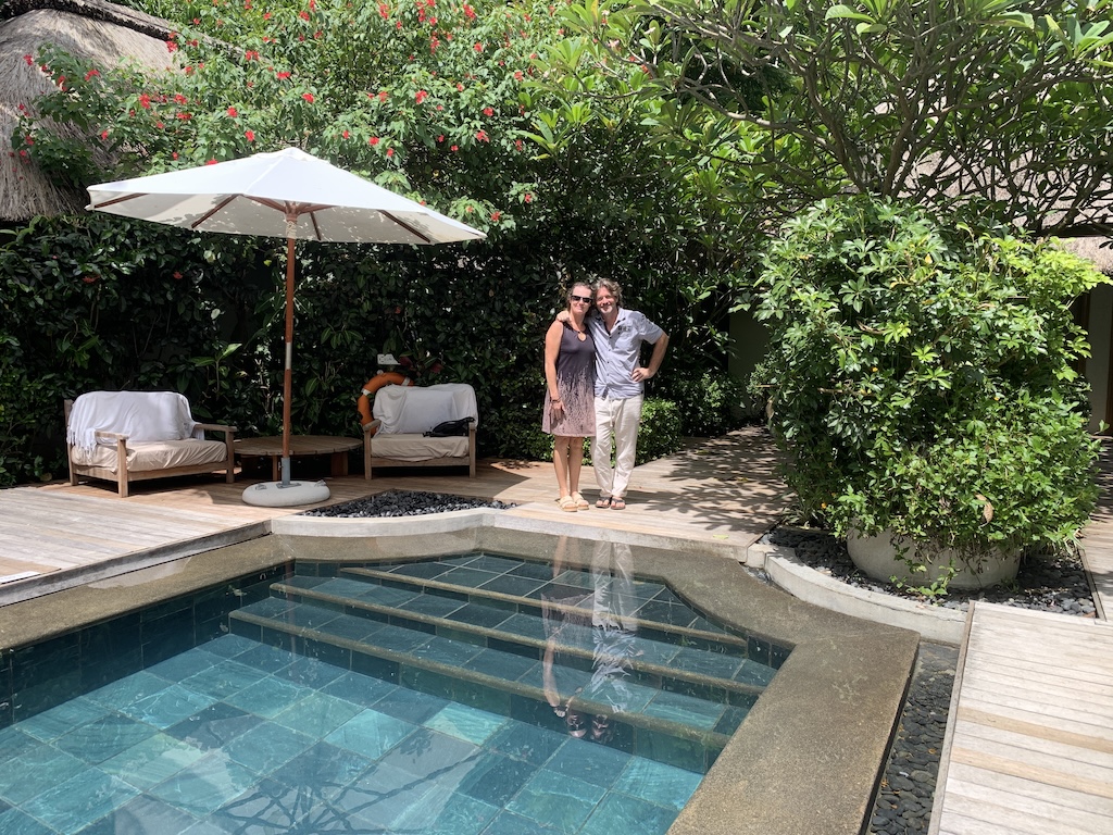Die Dame fragte uns nach unseren ersten Eindrücken. Wir sagten ihr, dass der Eingangsbereich auf jeden Fall ganz anders ist, als wir ihn in Erinnerung haben und dass wir gespannt seien, wie die restliche Anlage aussieht. Sie wollte wissen, an was wir uns noch erinnern, wo wir damals Fotos gemacht hätten usw. Ich zeigte ihr ein paar Fotos auf dem Handy. Dann meinte sie, der SPA-Bereich, der sähe noch ähnlich aus, aber das restliche Hotel wäre vor 10 Jahren renoviert und vergrössert worden. Als erstes begleitete sie uns zum SPA. Ja, den Pool, den erkannten wir sofort wieder und so baten wir sie, diese Foto von uns zu schiessen: