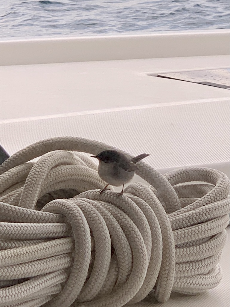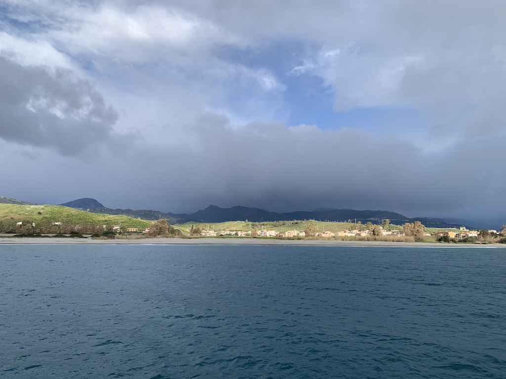 Am nächsten Morgen segelten wir, zeitweise mit einem zusätzlichen kleinen Crewmitglied, weiter an der Küste entlang Richtung Norden und bogen dann in die grosse Bucht vor Crotone hinein und ankerten ganz hinten unweit des Städtchens Soverato. Hier wetterten wir zwei Tage Starkwind und Regen ab. Es war unangenehm kalt und Guy meinte mehrmals: „es ist einfach noch zu früh“. Am dritten Tag hatten sich die Wellen „draussen“ ein bischen beruhigt, „nur“ noch 1-1,5m, aber von der Seite :-(, und gemässigter Wind bis max 20 Knoten. Also Anker auf und los, denn dies war die letzte Gelegenheit bevor eine Schlechtwetterfront mit Starkwind aus Ost eintreffen soll. Die Überfahrt war, wie so oft, nicht wirklich angenehm. Am Anfang, bis zum Cap, hatten wir Wind auf die Nase, also mussten wir gegenan motoren. Dann hatten wir nicht genügend Wind, also weiter motoren und dann nach einer gefühlten Ewigkeit, stellte sich endlich Wind ein, aber, wie so oft, wieder stärker als vorausgesagt… und mit ihm, höhere Wellen… Dementsprechend ruppig, unangenehm und schlaflos wurde dann auch die Nacht 😦
