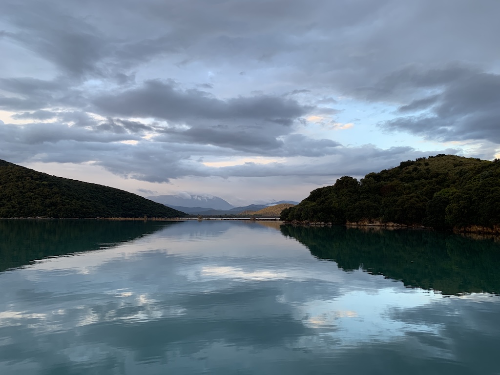 Wir waren den ganzen Tag über das einzige Boot, bevor sich am späten Nachmittag noch weitere 3 zu uns gesellten, um hier die Nacht zu verbringen. Obwohl wir wirklich geschlaucht von der Überfahrt waren, liessen wir das Beiboot zu Wasser um uns hier in Lakka ein bischen umzusehen. Die Restaurants, Bars und Shops waren noch alle geschlossen, aber die Lebensmittelgeschäfte und die zwei Bäcker waren geöffnet. Überall waren die Leute am Renovieren und Putzen, alles vorbereiten für den Saisonstart. Wenn das Wetter passt, dann würde ich gerne in ein paar Wochen noch einmal hierher zurückkommen. Am kommenden Tag nutzen wir den noch moderaten Südwestwind um weiter Richtung Norden zu segeln, denn unser erstes Saisonziel war Korfu. Doch zuerst mussten wir noch eine Schlechtwetterfront mit viel Regen und starkem Wind aus Ost abwettern. Wir „versteckten“ uns in einer kleinen Bucht am griechischen Festland. Die Ormos Lygia Iggy Creek Bucht war fast wie ein 6er im Lotto. Während „draussen“ aufgewühlte See herrschte und Windböen über 30 Knoten, fühlten wir uns wie auf einem Binnensee. Das Wasser war spiegelglatt und nur sehr selten frischte der Wind bis auf 10 Knoten auf. Zusammen mit zwei weiteren Booten, wetterten wir hier das schlechte Wetter ab. Doch immer wieder gab es auch eine  kleine Regenpause um kurz raus an die frische Luft zu gehen. So entstand auch dieses, wie ich finde, sehr schöne Foto… fast wie ein Gemälde 🙂
