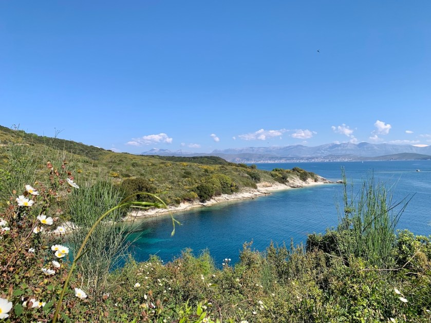 Hier vom Küstenweg aus, hatten wir eine schöne Aussicht auf den Küstenort Saranda und die Berge von Albanien.