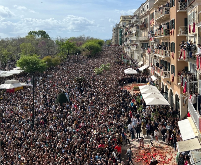 Am Samstag morgen machten wir uns nach dem Frühstück auf den Weg Richtung Altstadt. Dass wir hier auf eine riesige Menschenmasse treffen würden, war uns schon klar. Schon ab 8 Uhr kam ein Bus nach dem anderen. Während dem Frühstück schauten wir zu, wie ganze Prozessionen an Leuten Richtung Altstadt spazierten. Um 10 Uhr war eine riesige Anzahl an Bussen entlang der ganzen Bucht geparkt. Uns grauste es, doch wir haben ja extra hier auf Korfu „gewartet“ um einmal diesem Botides-Brauch beizuwohnen. Also machten mir uns mit dem Beiboot auf den Weg Richtung Naokhafen, wo wir dieses sicher zurücklassen konnten. Wir „Bootsmenschen“ hatten es wahrscheinlich am Einfachsten an diesem Tag in die Stadt zu gelangen, denn die Polizei hatte die Strassen grossräumig gesperrt und freie Parkplätze gab es seit Tagen ohnehin keine mehr. Also mussten die meisten Besucher lange Strecken mit dem Bus oder zu Fuss in Kauf nehmen. Oben am Spianadaplatz angekommen waren wir echt geschockt…eine gigantische Menschenmasse!!! Leute, die in einer asiatischen Megametropole leben, hätten diesen Trubel vielleicht als „normaler“ empfunden, aber für uns, wow, der reinste Wahnsinn!