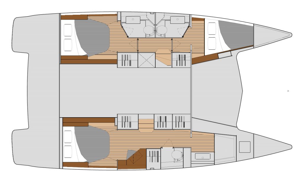 Der Steuerbordrumpf ist der „Eignerbereich“ mit Bad, Dusche und abgetrenntem Toilettenraum.